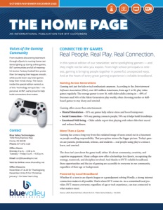 Contact Blue Valley Technologies 1559 Pony Express Hwy Home, KS 66438 Phone: 877.876.1228 Office Hours: Monday 9 a.m. – 4:30 p.m. Tuesday – Friday 8 a.m. – 4:30 p.m. Email: csr@bluevalleyinc.net Visit Us Online: www.bluevalley.net Office Closures: November 27 & 28 for Thanksgiving December 24 & 25 for Christmas January 1 for New Year's Day Voices of the Gaming Community From students discovering teamwork through eSports to nursing home residents lighting up during online games, BVT communities are full of meaningful stories. Fantasy football fans praise fiber for keeping their leagues smooth, while puzzle lovers say brain games keep their minds sharp. The voices inside this special edition remind us of this: Technology isn’t just fast— it’s personal. At BVT, we’re proud to help build connections that matter. OCTOBER/NOVEMBER/DECEMBER 2025 THE HOME PAGE AN INFORMATIONAL PUBLICATION FOR BVT CUSTOMERS In this special edition of our newsletter, we’re spotlighting gamers — and they might not be who you expect. From high school principals to retirees, gaming is bringing people together in powerful, unexpected ways. And at the heart of every great gaming experience is reliable broadband. Gaming Across Generations Gaming isn’t just for kids or tech enthusiasts anymore. According to the Entertainment Software Association (ESA), over 205 million Americans, from age 5 to 90, play video games regularly. The average gamer is now 36, with older adults joining in—49% of Boomers and 36% of the Silent Generation play weekly, often choosing puzzles or skillbased games to stay sharp and unwind. Gaming offers more than entertainment: • Mental Stimulation – 81% say games help relieve stress and boost brainpower. • Social Connection – 76% say gaming connects people; 78% say it helps build friendships. • Emotional Well-being – Older adults report that playing with others lifts their mood and reduces loneliness. More Than a Game Gaming has come a long way from the outdated image of teens zoned out in a basement or people avoiding responsibility. That perception misses the bigger picture. Today’s gamers are parents, professionals, retirees, and students—real people using play to connect, learn, and unwind. The draw isn’t just about the game itself, either. It’s about community, creativity, and cognitive engagement. Many colleges now offer scholarships for eSports, recognizing the strategy, teamwork, and discipline involved. And thanks to BVT’s reliable broadband, these opportunities and the joy of gaming are accessible to everyone in our community, regardless of their age or background. Powered by Local Broadband Whether it’s a teen in an eSports league or a grandparent solving Wordle, a strong internet connection makes it all possible. That’s where BVT comes in. As a committed local provider, BVT ensures everyone, regardless of age or tech experience, can stay connected to what matters most. Source: 2025 Essential Facts About the U.S. Video Game Industry - the ESA CONNECTED BY GAMES Real People. Real Play. Real Connection.