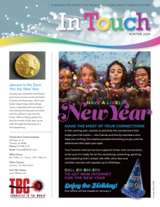 In Touch Titonka-Burt Communications 247 Main St. N Titonka, IA 50480 Phone: 515.928.2110 Email: Titonka@TBCtel.com Office Hours: M–F 8:00 a.m. - Noon, 1:00 - 5:00 p.m. Office Closure: January 1 for New Year’s Visit TBC Online: www.TBCtel.com January Is the Door Into the New Year January was named for the Roman god Janus, known as the protector of gates and doorways, which symbolize beginnings and endings. Janus is depicted with two faces— one looking into the past, the other with the ability to see into the future. What a fitting symbol for the first month of the year, as we walk through the doorway to a new beginning. A NEWSLETTER FROM YOUR FRIENDS AT TITONKA-BURT COMMUNICATIONS WI NTER 2 0 26 Cornerstone Group © 2026 HAVE A LIVELY New Year MAKE THE MOST OF YOUR CONNECTIONS In the coming year, resolve to prioritize the connections that make your life livelier — the friends and family members who keep you smiling, the creative pursuits that bring you joy, and the adventures that open your eyes. Your home’s internet service supports these vital connections, so be sure it’s ready for all the socializing, streaming, gaming, and exploring that’s ahead. We offer ultra-fast and reliable internet with speeds up to 200Mbps. CALL 515-928-2110 TO GET NEW INTERNET FOR THE NEW YEAR Enjoy the Holiday! Our office will be closed on January 1.
