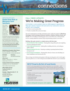 Cornerstone Group © 2025 FALL 2025 A QUART E R LY N EWS L E T T E R F ROM WA I T S F I E L D AND CHAMP L A I N VA L L E Y T E L E COM connections 800-496-3391 • www.wcvt.com EMPLOYEE SPOTLIGHT: Daniel Gives Back at Merrymac Farm Sanctuary When Daniel Hollister is not helping our customers with tech support, he shares his time and kindness with the animals at Merrymac Farm Sanctuary in Charlotte. It provides a home for neglected and abandoned farm animals, giving them a second chance. We’re proud to see Daniel bringing so much heart to both his work and his volunteer efforts. Learn more about Merrymac Farm Sanctuary at www.merrymacfarmsanctuary.org. Waitsfield and Champlain Valley Telecom PO Box 9, Waitsfield, VT 05673-0009 Phone: 802-496-3391 • Toll Free: 800-496-3391 Waitsfield: Route 100 Office Hours: Monday – Friday: 8:00 a.m. - 5:00 p.m. (Lobby closes at 4:30 p.m.) Contact Customer Service for assistance csdept@corp.wcvt.com • 800-496-3391 Visit us online at www.wcvt.com Office Holiday Closures: Tuesday, November 11 Veterans Day Thursday – Friday, November 27 – 28 Thanksgiving Holiday Thursday, December 25 Christmas Holiday Hinesburg: 246 Mechanicsville Road FALL FIBER UPDATE: We’re Making Great Progress WCVT Proud to Be Part of Local Events At WCVT, we’re always grateful for the chance to spend time in our communities — catching up with familiar faces and meeting new ones. This fall, we had a great time at the Bristol Harvest Festival and the Vermont Biz2Biz Expo. Thanks to everyone who stopped by our booth to say hello! In addition, we were proud to support a number of local events this season, such as: • Vermont Works for Woman Expo • Bristol Harvest Festival • Richmond Art Crawl • We Are MRV Community Celebration There’s nothing like having fun with neighbors! As fall settles in, we’re excited to share our 2025 progress in expanding our fiber-optic network. Thanks to the hard work of our construction crews and partners, we’ve completed: • 205 miles of aerial mainline fiber • 93 miles of mainline fiber and service drops Our crews remain hard at work this construction season, with active projects in Hinesburg, Huntington, North Ferrisburgh, Richmond, Starksboro, Waltham, Monkton, Bristol, and Lincoln. We’re also filling in remaining gaps across several other areas, which primarily involves running additional customer drops and performing customer conversions. Building a fiber-optic network is a complex process with these steps: • Strand & Mainline Fiber Installation – Running fiber along utility poles and completing necessary underground sections • Fusion Splicing & Electronics – Splicing fiber, installing electronics, and setting up splitter cabinets • Network Testing & Turn-Up – Ensuring everything is operating flawlessly before moving forward • Service Drops & Installations – Running fiber directly to homes and scheduling customer installations once the network is live These are large-scale infrastructure projects with many moving parts, and we truly appreciate your patience as we work to bring fast and reliable fiber internet to your community.