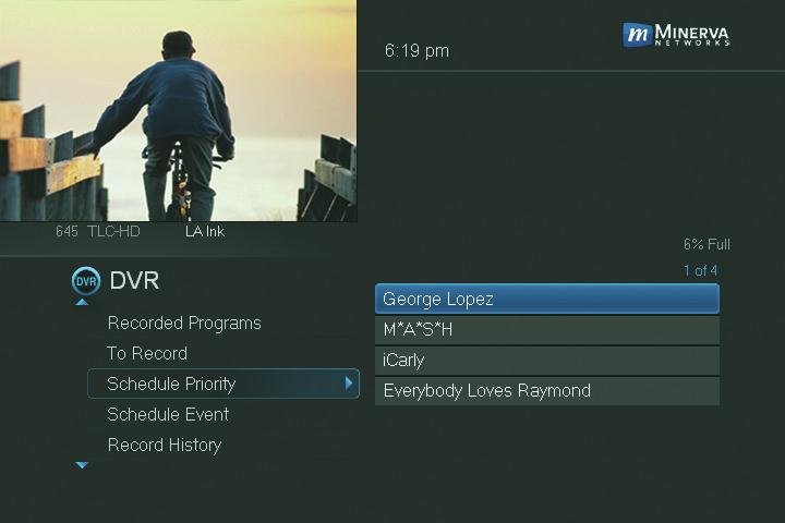 Schedule Priority lists all series recordings you have scheduled. The series with the highest priority is listed frst. This program will always be recorded in preference to any other series recording. The series with the lowest priority is listed last. This program will be skipped in preference to any other series recording.