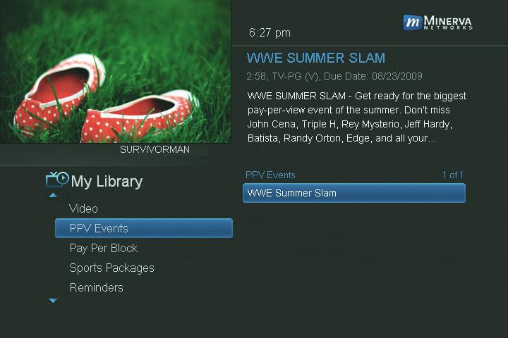 Highlight PPV Events and press OK. All purchased pay per view events are listed to the right. Highlight the event you want to watch and press OK for information and viewing options.