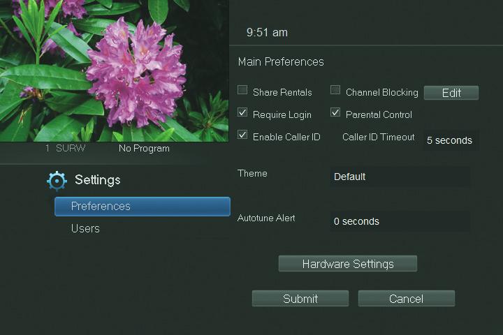 Preferences - settings that affect your overall service. This includes if purchased programs are shared between users, if users must log in, how on-screen alerts are handled, parental controls and blocked channels that apply to everyone.