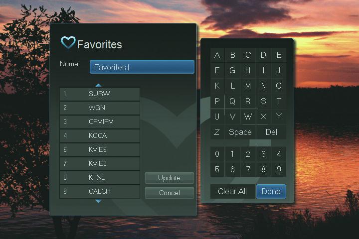 The Name: box is already highlighted. Press OK to use the on-screen keyboard to change the name for your favorites list. First, highlight Clear All and press OK to clear the default name. Highlight each letter in the new name and press OK. Once you have entered the name, highlight Done and press OK.