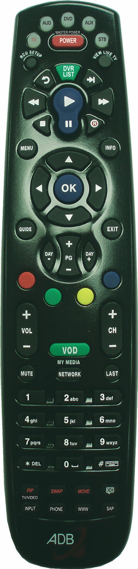 Device Selection Send commands to TV, audio, DVD, auxiliary device or set top box RCU SETUP Setup remote DVR LIST For future use MENU