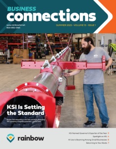 2 Summer 2025 Business Connections is a publication of Rainbow Communications, 608 Main St., Everest, KS 66424. Editorial and Circulation Contact: Jackie Petersen 608 Main St. Everest, KS 66424 800.892.0163 x1105 Extra issues are available to business customer employees on a limited basis while supplies last. Contact: Jackie Petersen 608 Main St. Everest, KS 66424 800.892.0163 x1105 All brand names and product names used in this publication are trade names, service marks, trademarks, or registered trademarks of their respective owners. Copyright® 2025 by Rainbow Communications and Cornerstone Publishing Group, Inc. Postmaster send changes to: Jackie Petersen PO Box 147 Everest, KS 66424 PRINTED ON RECYCLED PAPER Ideas are seeds that grow into something more. They start out small, but with time and nurturing, can become technology with huge impact.The seed theme for this summer issue of Business Connections was inspired by the Business Spotlight on KSi, which you’ll find on pages 4 and 5. KSi developed a patented, cleated belt technology that outperformed conventional augers and belt conveyors for moving seed. The family-owned business, with locations in Sabetha, Kansas, and Cissna Park, Illinois, is known for innovation. Rainbow is proud to partnerwithKSi tomeet their high-speed Internet needs in Sabetha. Page 3 provides a preamble to the Business Spotlight, KSi Named Governor’s Exporter of the Year. Rainbow joins all Kansans in congratulating KSi and thanking them for helping our state grow into something more. KSi uses industrial automation and AI to address challenges like rising labor costs, labor shortages, and operational inefficiencies. Have you experimented with AI at your business yet? Check out AI Use Is Booming Among Small Businesses on page 6 for implementation ideas. Don’t miss Returning to Your Roots on page 7, which features Duane Kaeb, Director of Technology at KSi. After college, he returned to his Sabetha roots for years, and he now connects virtually from his home office in Riverview, Florida. No matter what field your business is in, Rainbow encourages you to plant seeds for growth. Please contact us to discuss the communications technology required. Sincerely, The Rainbow Customer Relations and Business Development Team connections BUSINESS First row: Suzanne Schuster, Julie Bergman, and Deanna Lanter Second row: Cheryl Moon, Jenny Haislip, and Jennifer Hermesch Third row: Angie Kreider, Jerad Enneking. and Madelyn Coleman Not pictured: Mikayla Parsons SUMMER 2025