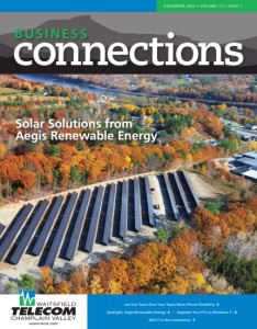 4 DECEMBER 2025 BUSINESS SPOTLIGHT Headquartered in Waitsfield, Aegis Renewable Energy is a Vermont-based solar installer and trusted partner for commercial, design-build energy projects throughout New England. Powerful Services Aegis provides a complete range of services for the development, installation, and sale of commercial solar and community-scale solar energy systems. These services encompass every step from feasibility and site analysis to Engineering, Procurement, and Construction Management (EPC) to final commissioning and maintenance. Since its founding in 2011, Aegis has designed and installed 50+ solar energy systems totaling over 48 megawatts. This installed capacity consists entirely of ground-mounted and rooftop commercial solar projects, ranging in size from 150 kW up to 7MW. Aegis was a powerful shield of Zeus, the king of the gods. It was also used by Apollo, god of the sun as well as Artemis, goddess of the hunt. Nils Behn, CEO of Aegis Renewable Energy, chose the name because he values the sun and protection of the planet’s resources. He said, “Renewable Energy is what we do … the center part of our logo represents the Sun, without it we would not exist. We enable our customers, with the tools we provide, to harvest the clean and renewable power of the Sun.” Every solar panel installed by Aegis means that 50 lightbulbs can be turned on without dependence on the fossil fuels responsible for the rapid destabilization of our planet’s climate. Every solar panel also means parents are actively working toward a future they can be proud to hand over to their children. A Beneficial Phone Update To work efficiently, the Aegis team needs reliable phone communication. That’s why Aegis replaced an outdated system with Hosted IP Phone Service from WCVT. Vice President Sonia Behn said, “Our team often works in many different locations, whether that be in the office, out in the field Aegis Renewable Energy Acting in the best interests of customers and our planet